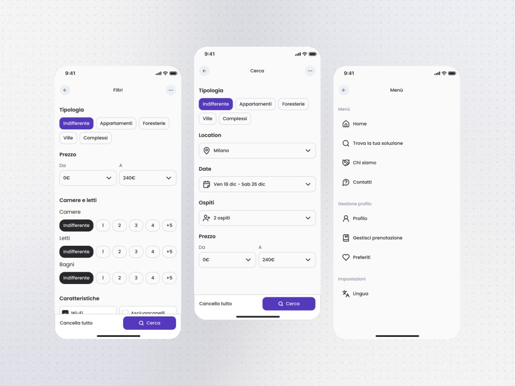 From left to right: Search Engine (list view) – Homepage – Search Engine (map view)